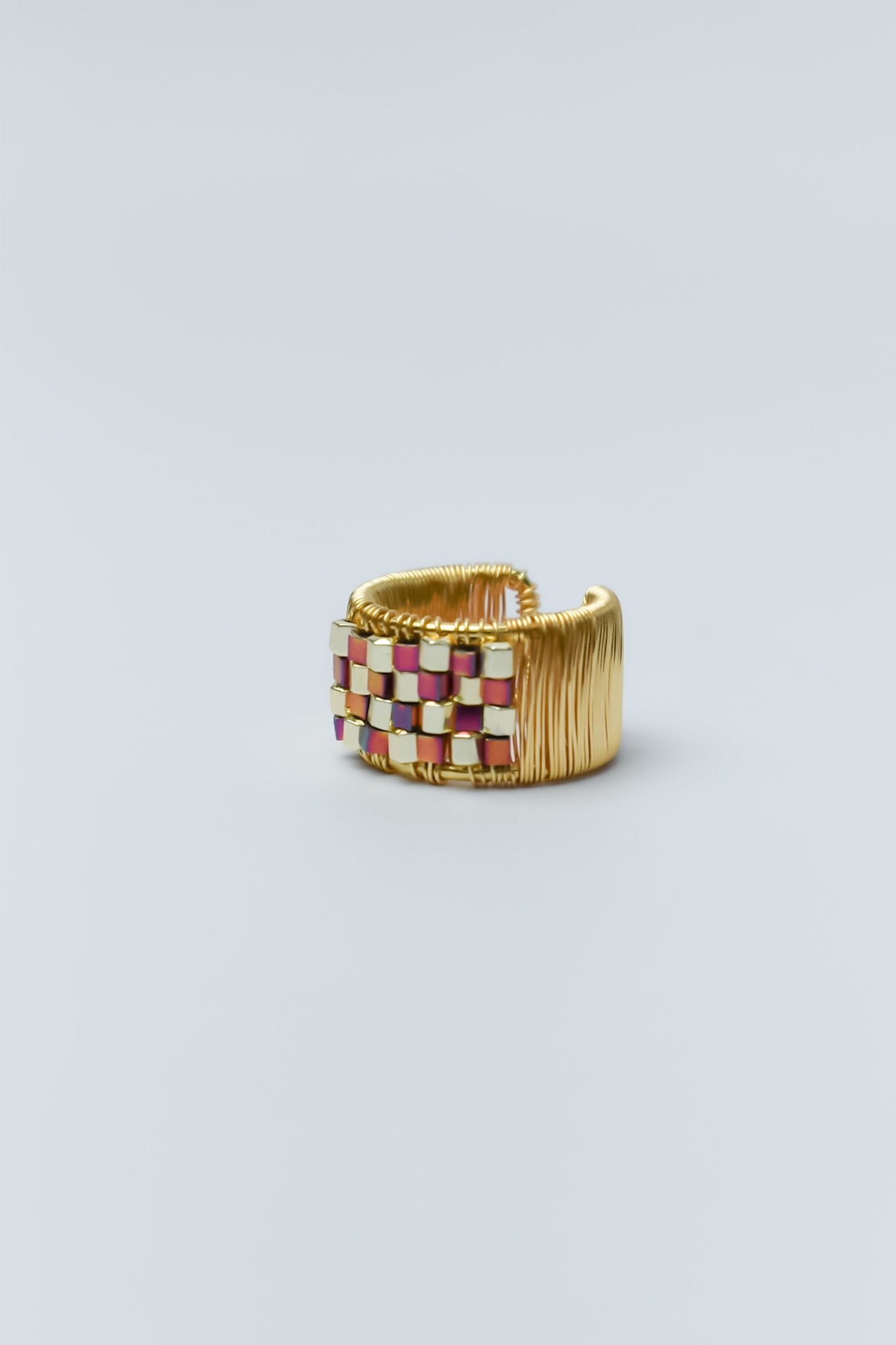 Tejido elaborado en hilos de bronce bañados en oro, con pedrería en acerina.