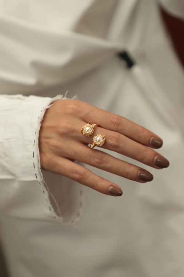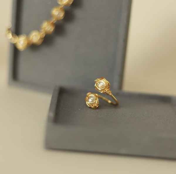 Anillo en hilos de cobre bañado en oro de 24k con perlas, diseñado y elaborado 100% mano por nuestras artesanas.