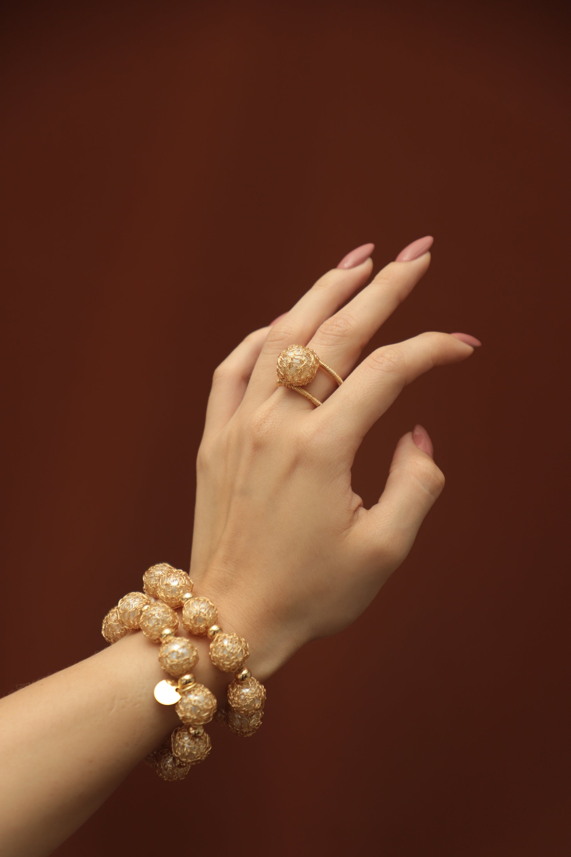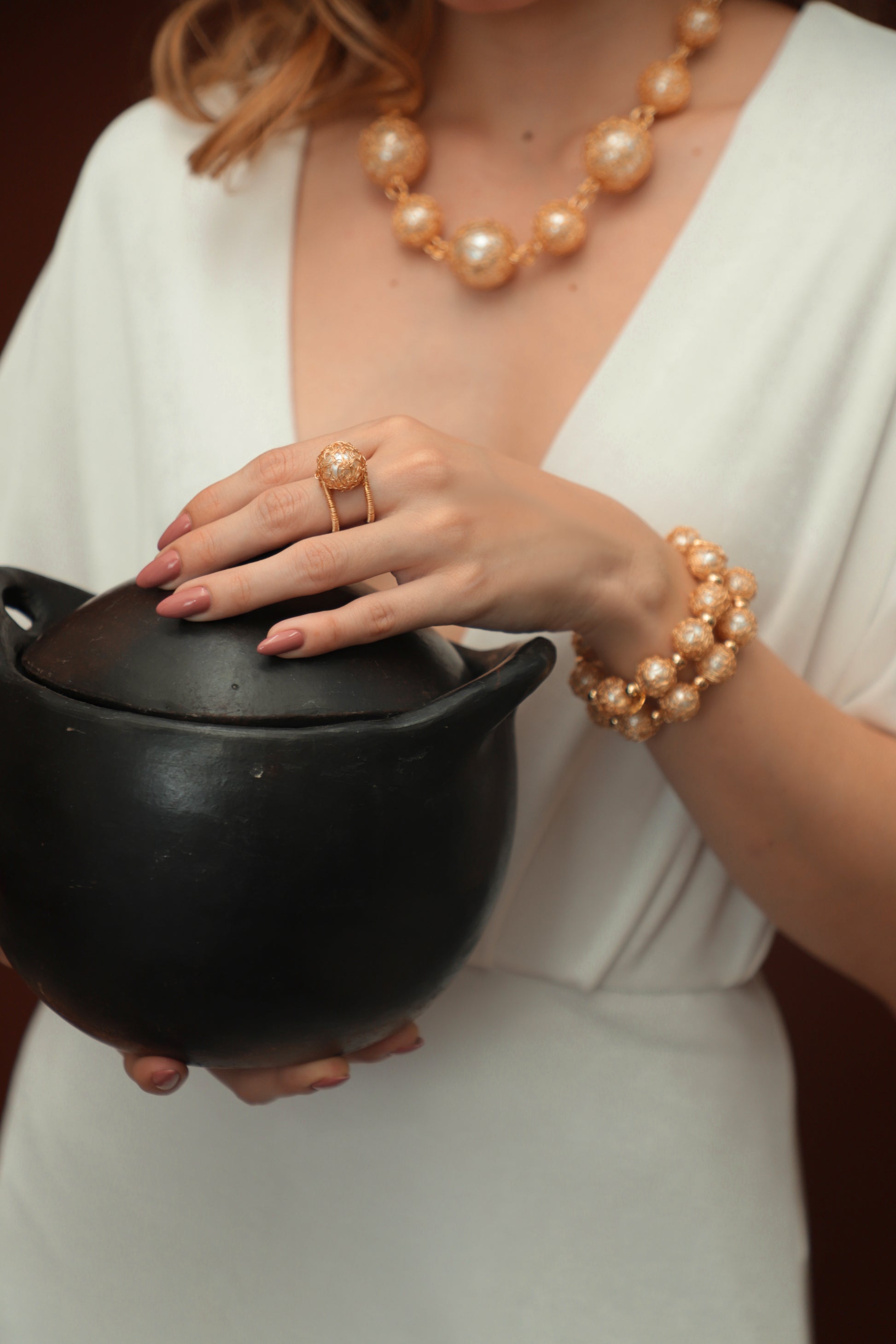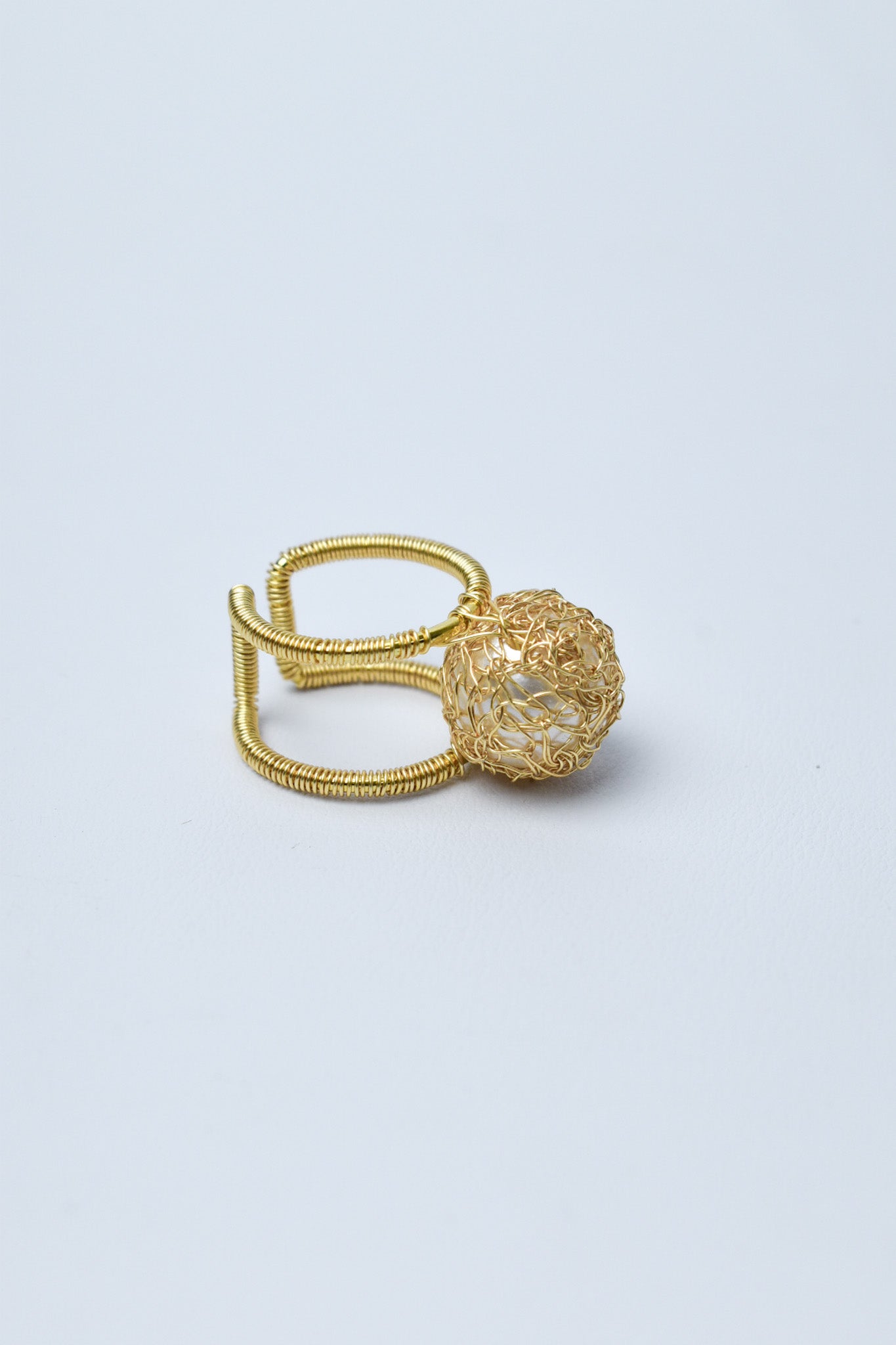 Anillo graduable, elaborado en cobre con baño de oro y perla cubierta con tejido de hilos de cobre bañados en oro.