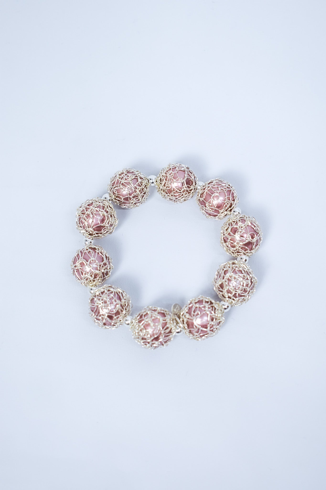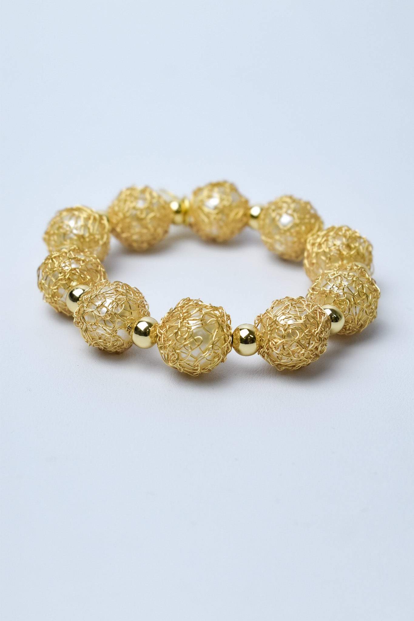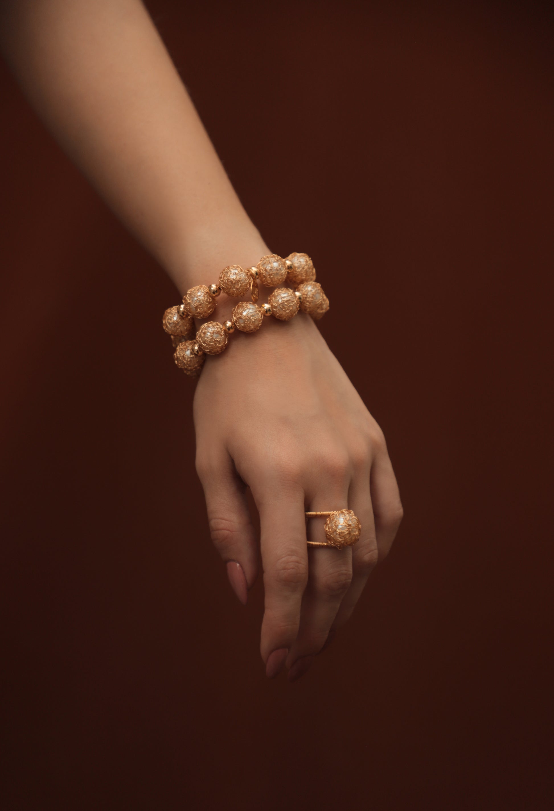 Anillo graduable, elaborado en cobre con baño de oro y perla cubierta con tejido de hilos de cobre bañados en oro.