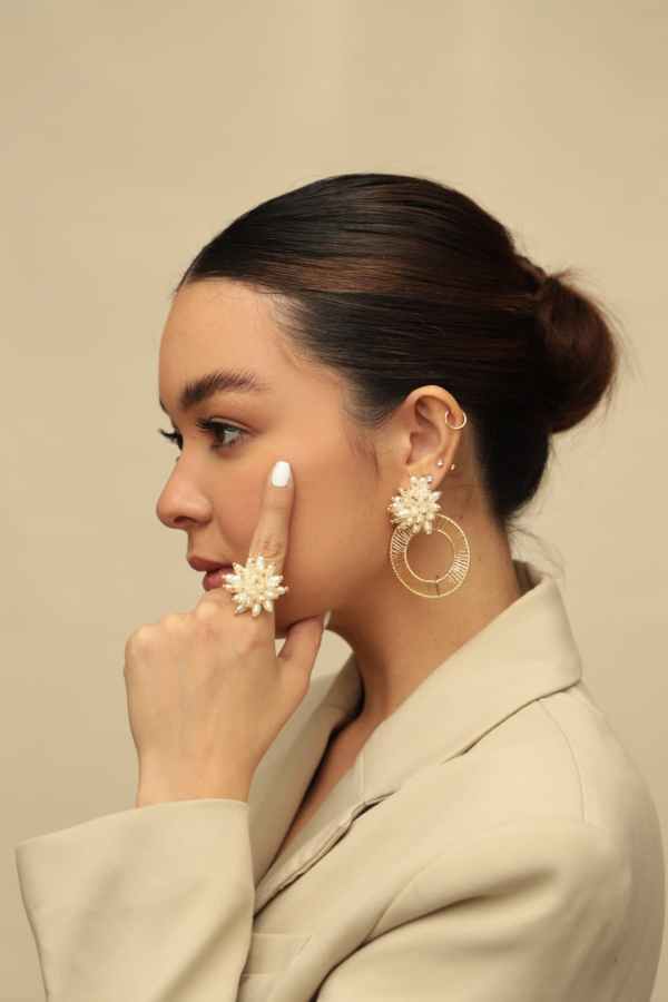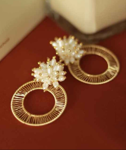 Aretes en hilos de cobre bañados en oro de 24k y perlas elaborados 100% a mano por nuestros artesanos.