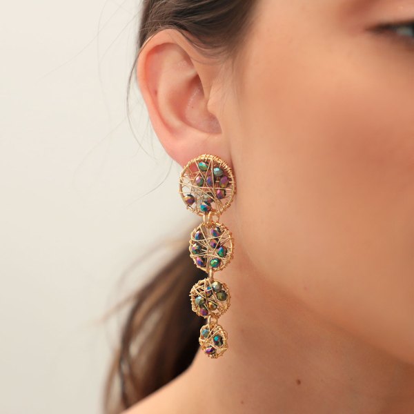 Aretes en hilos de bronce bañados en oro de 24k y piedras de murano, elaborados 100% a mano por nuestros artesanos.