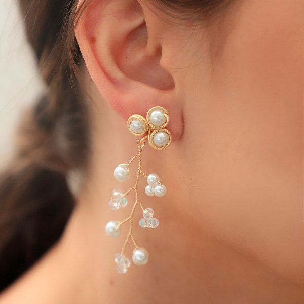 Aretes en hilos de bronce bañados en oro de 24k, perlas y piedras de murano, elaborados 100% a mano por nuestros artesanos.