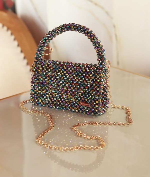 Bolso mediano tipo sobre en murano con correa en cadena dorada elaborado 100% a mano por nuestros artesanos.