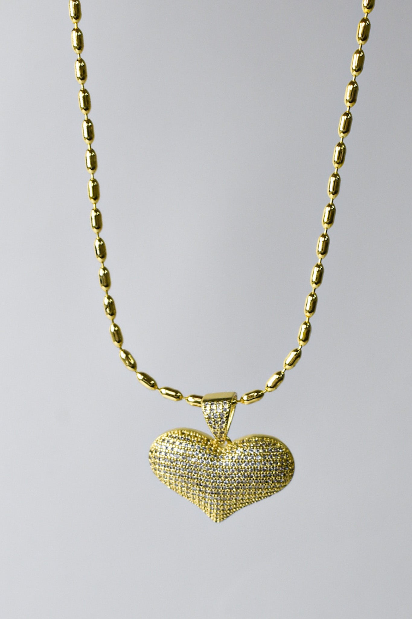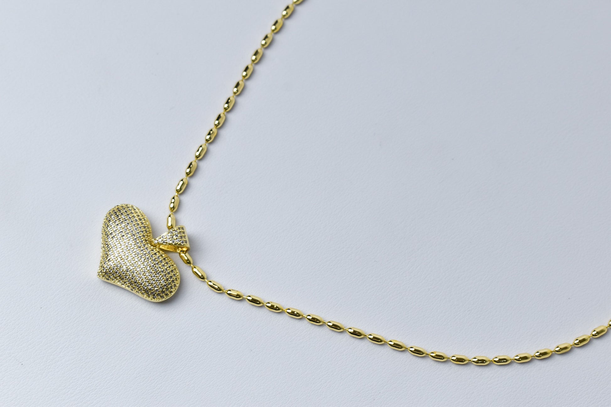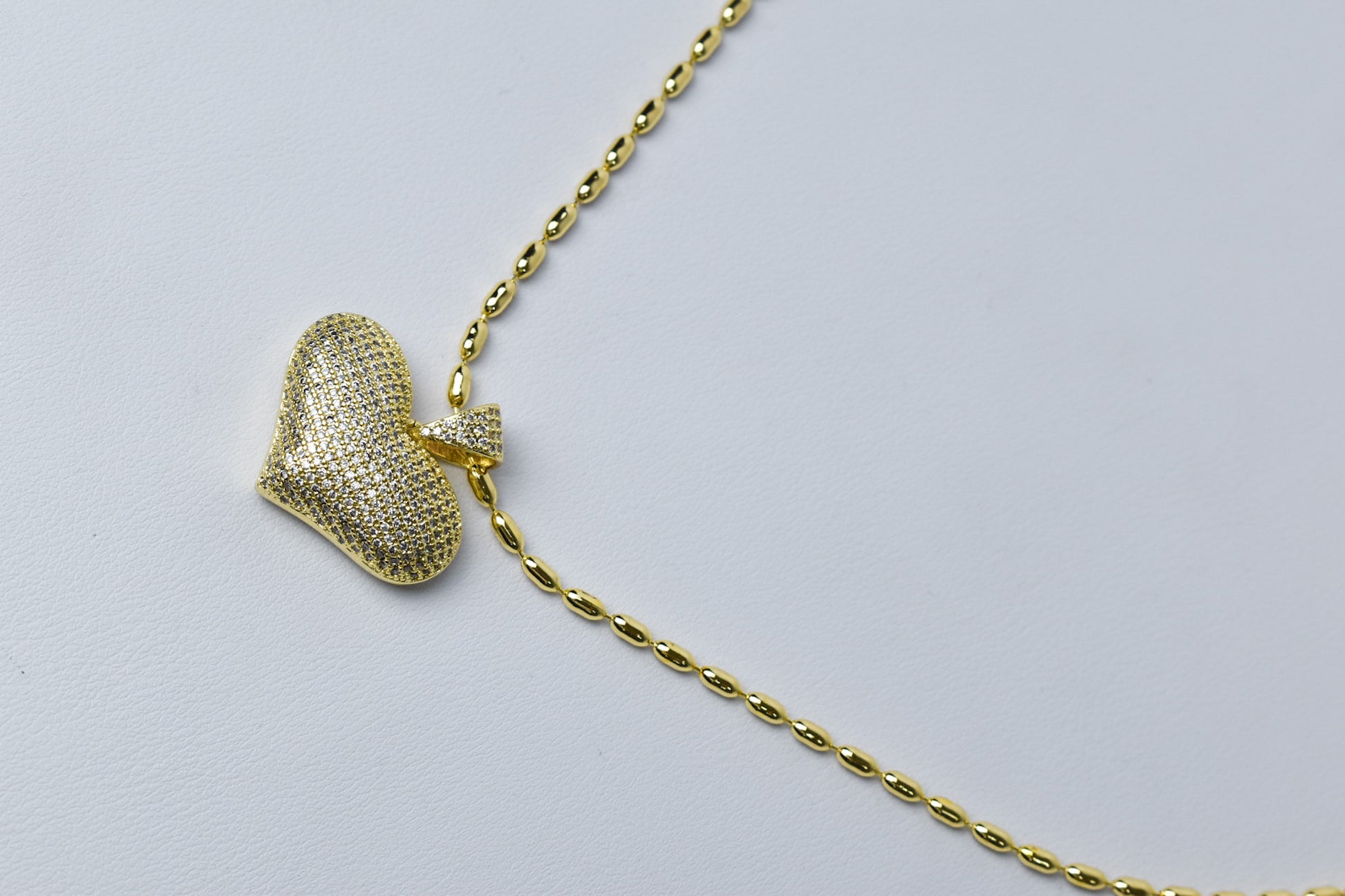 Esta delicada cadena dorada elaborada con balines ovalados, presenta un dije en forma de corazón adornado con pequeños brillos que realzan su elegancia.