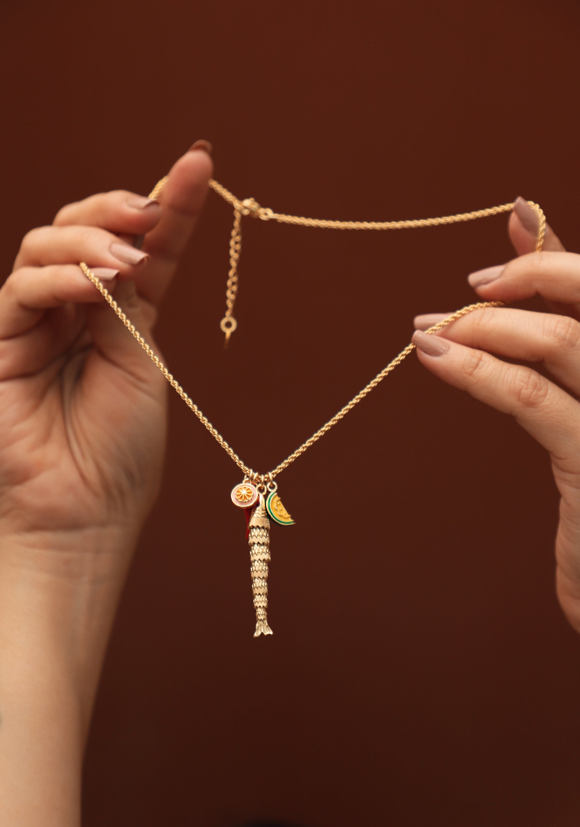 Su diseño evoca elementos como el pez y las frutas, símbolos de abundancia y vida.