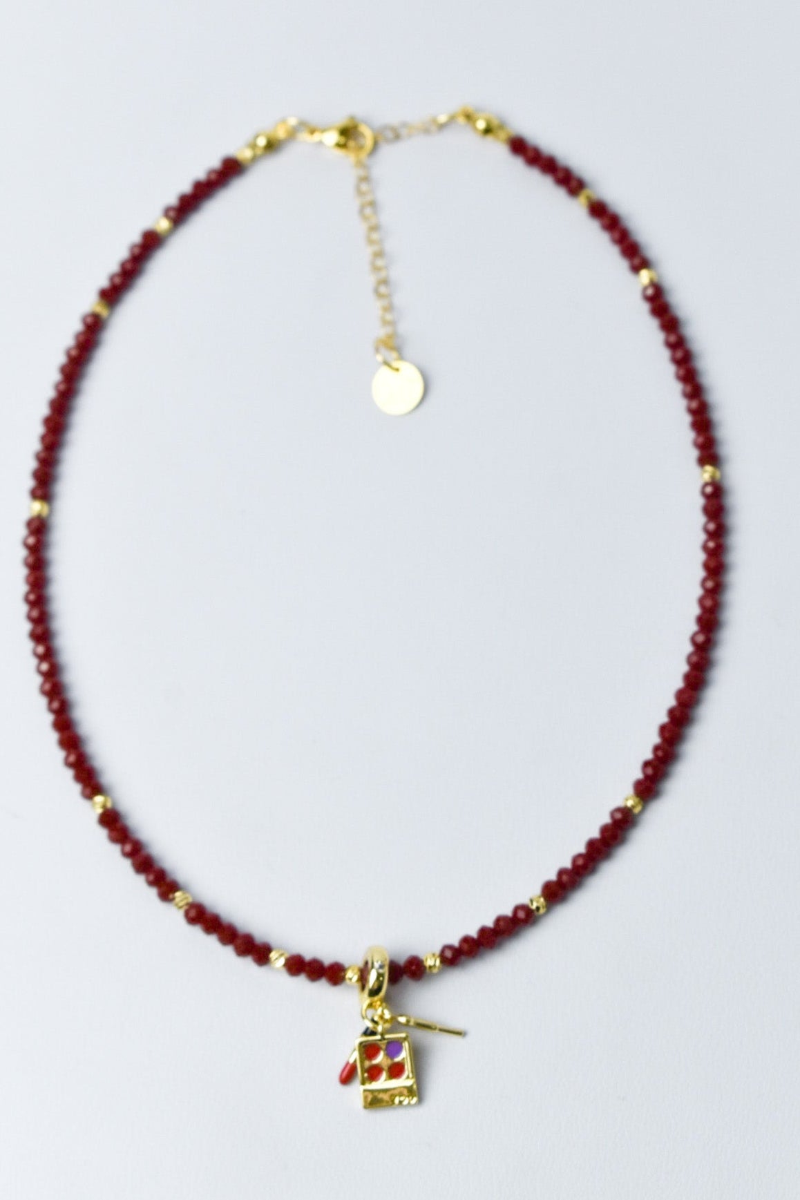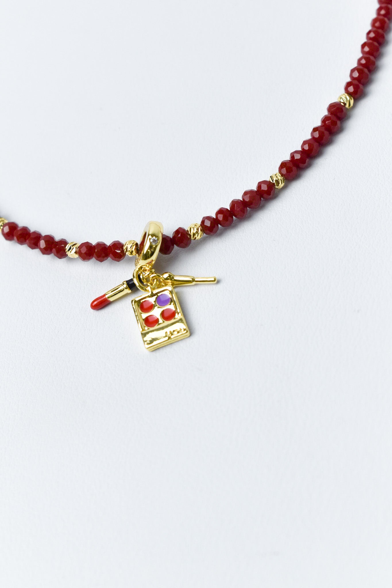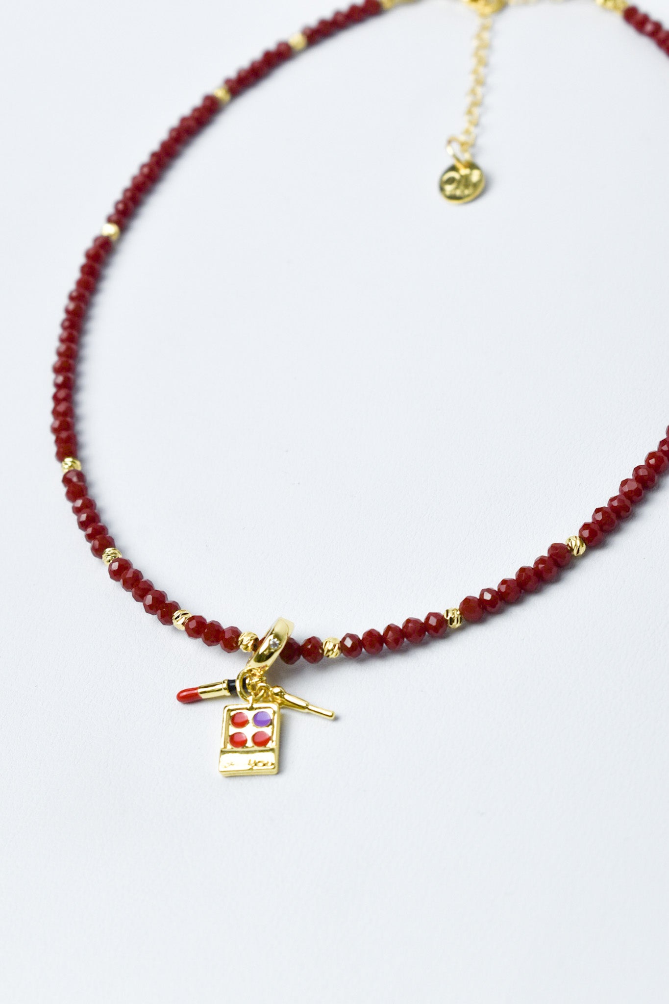 Este chocker está elaborado con exquisito vidrio murano y presenta dijes inspirados en el maquillaje, con un elegante acabado en color vinotinto. Su diseño exclusivo aporta un toque sofisticado y moderno, ideal para quienes buscan resaltar su estilo con piezas únicas y llenas de personalidad. Perfecto para complementar cualquier outfit con un detalle artístico y cuidado.