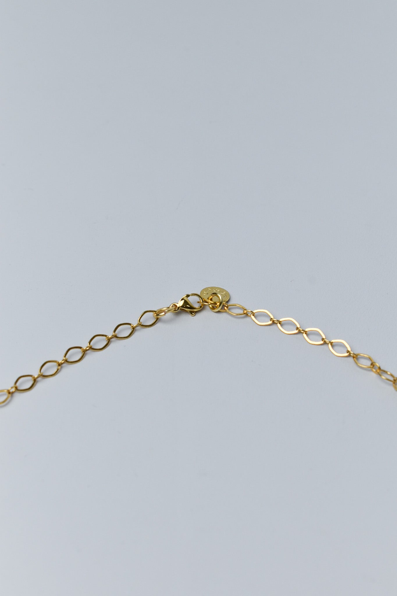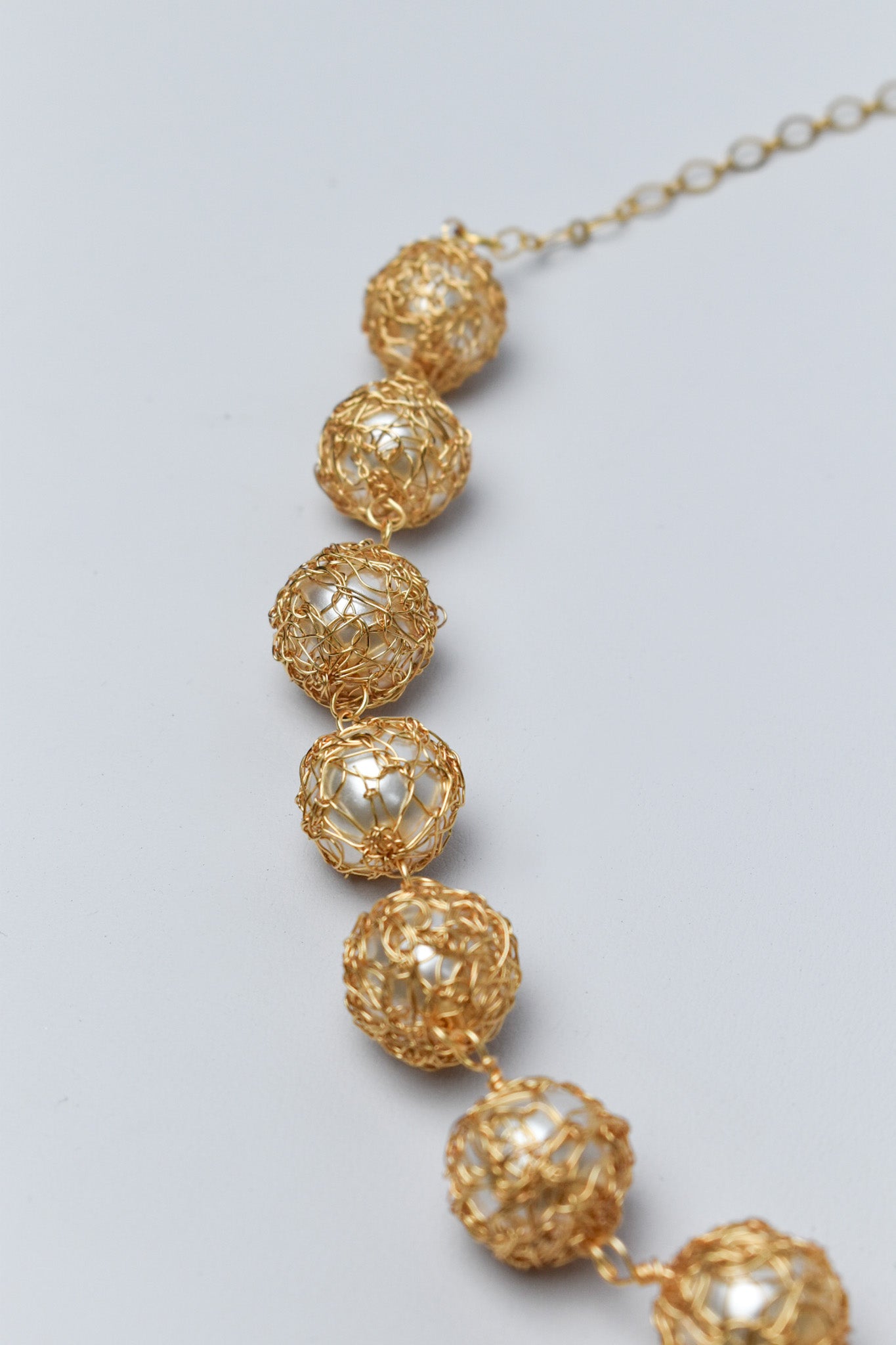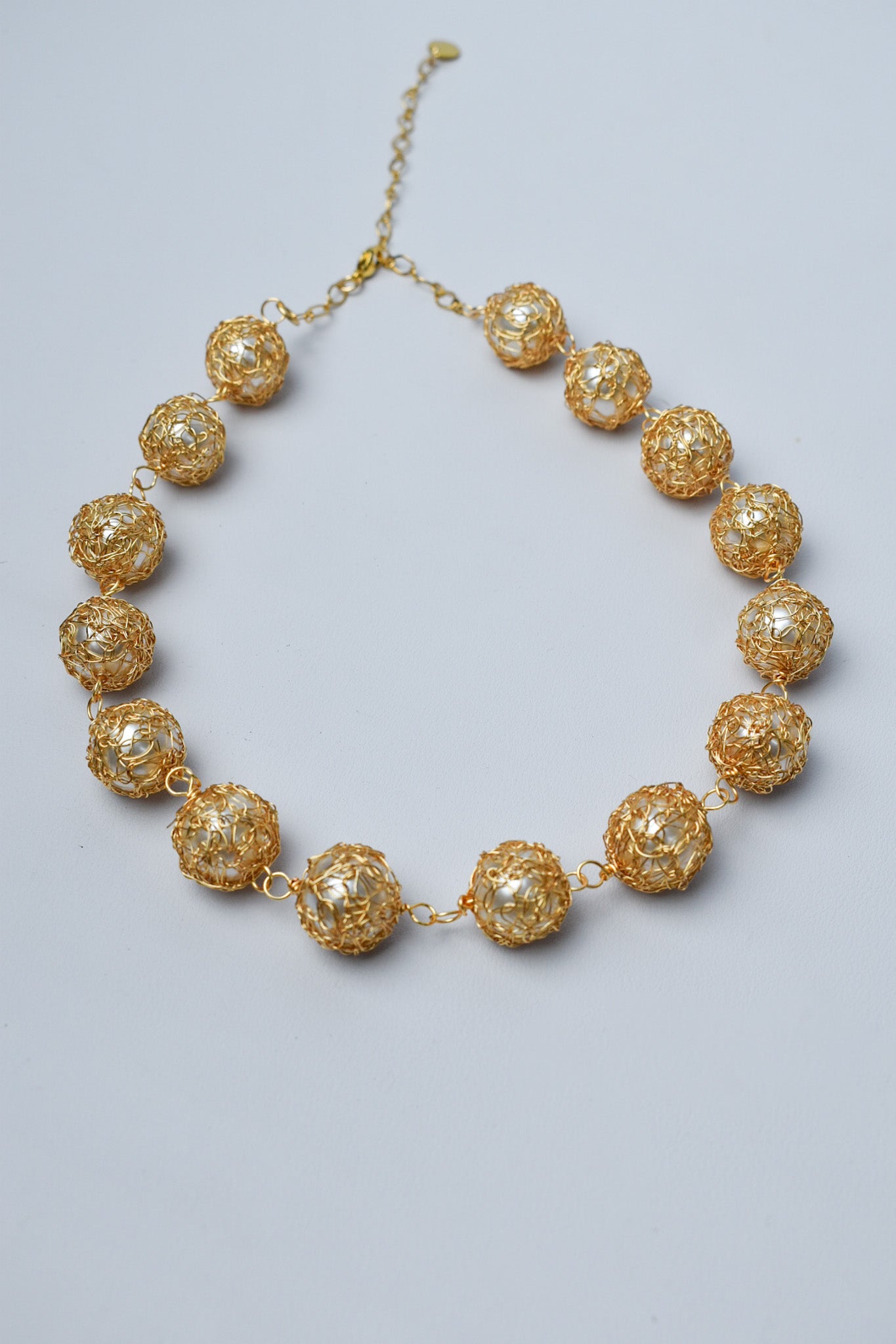 Collar de perlas decoradas con hilos dorados que se entrelazan como raíces bajo la tierra.