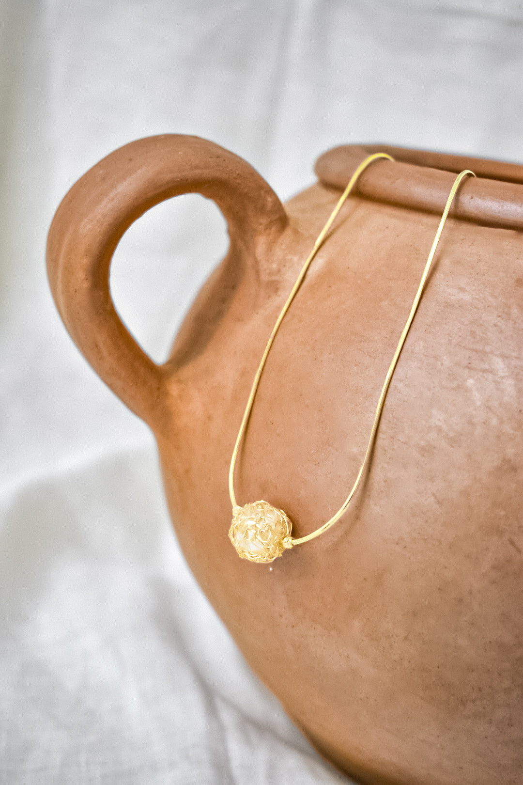 Incluye 1 perla decorada con hilos dorados que se entrelazan como raíces bajo la tierra.