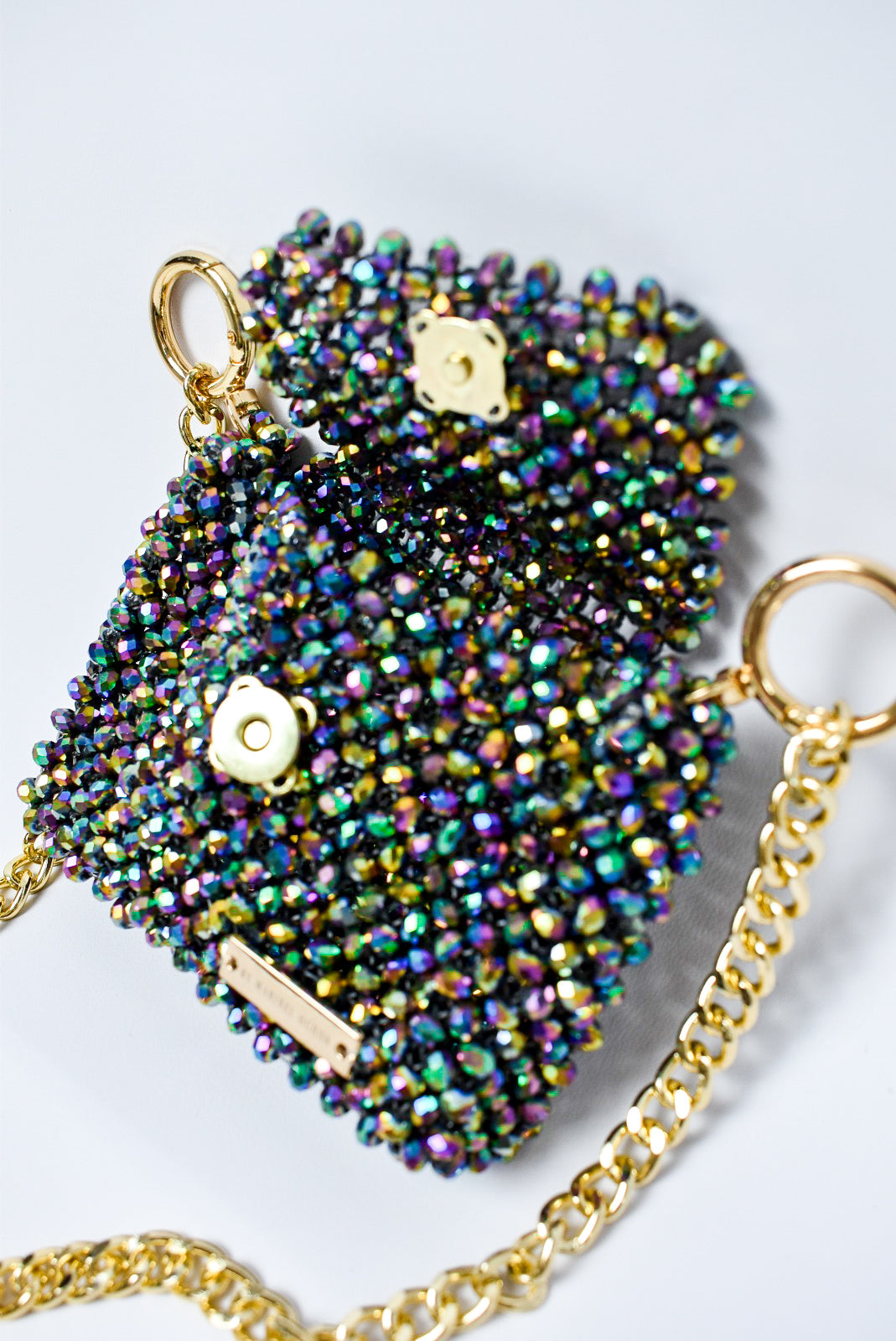 Este mini bolso tejido con cristales de Murano aporta un toque único y sofisticado a tu estilo. Su diseño delicado y brillante transforma cualquier outfit en una declaración de moda irrepetible, ideal para destacar en cualquier ocasión. Llena tu look de elegancia y distinción con este accesorio exclusivo.